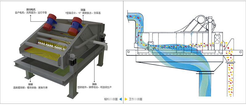 1、篩機整體采用水平安裝,篩網傾斜安裝,可以保證強制脫水;
